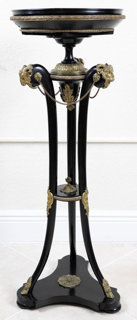 CHINOISERIE ORMOLU-MOUNTED PARCEL-GILT LACQUER SIDE TABLE6 days LeftA Louis XVI style gilt bronze mounted nero marquina marble tapered square pedestal, modernApr 01, 2026Restauration Bronze Figural Candelabra Lamps, PairApr 07, 2026French Empire Napoleon III rouge marble and gilt dore bronze urn lamp conversion with ram head and5 days LeftFrench Empire Bronze Mounted Marble Top Mahogany PedestalEmpire Style Porcelain Oil Lamp Mounted as Lamp3 days LeftNeoclassical Style Mahogany Plant StandMay 07, 2026Antique cast iron Hat Stand with fancy footed base and large wooden ball hat rest, measures 24" T on6 days LeftEmpire Style Swan Motif Ebonized Wood Pedestals, 2Apr 07, 2026Labarge Regency Style Rams Head Round Occasional TableThree Legged Fern Stand, Walnut With Twist ColumnsApr 18, 2026Arts & Crafts Wrought Iron 4-Branch CandelabraMay 21, 2026Vintage Neoclassical Marble Top Ram's Head Tripod Table by Turtle and Crane - Hollywood Regency StylVintage Wrought Iron and Brass Scrollwork Table LampMar 31, 2026Burl Mahogany Pie Crust Top Whisky StandApr 06, 2026Antique Continental Lamp Table with Brass Feet5 days Left