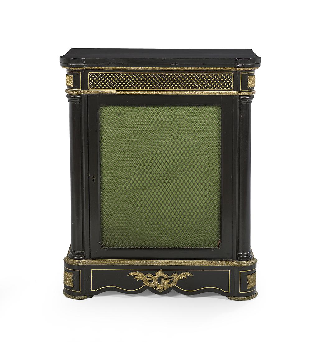 SoldNapoleon III Ebonized CabinetNapoleon III Ebonized Cabinet third quarter 19th century, the rectangular top with turreted corners, above a conforming case fitted with a single cupboard door, with a fabric-backed grille panel, raisSee Sold Price
