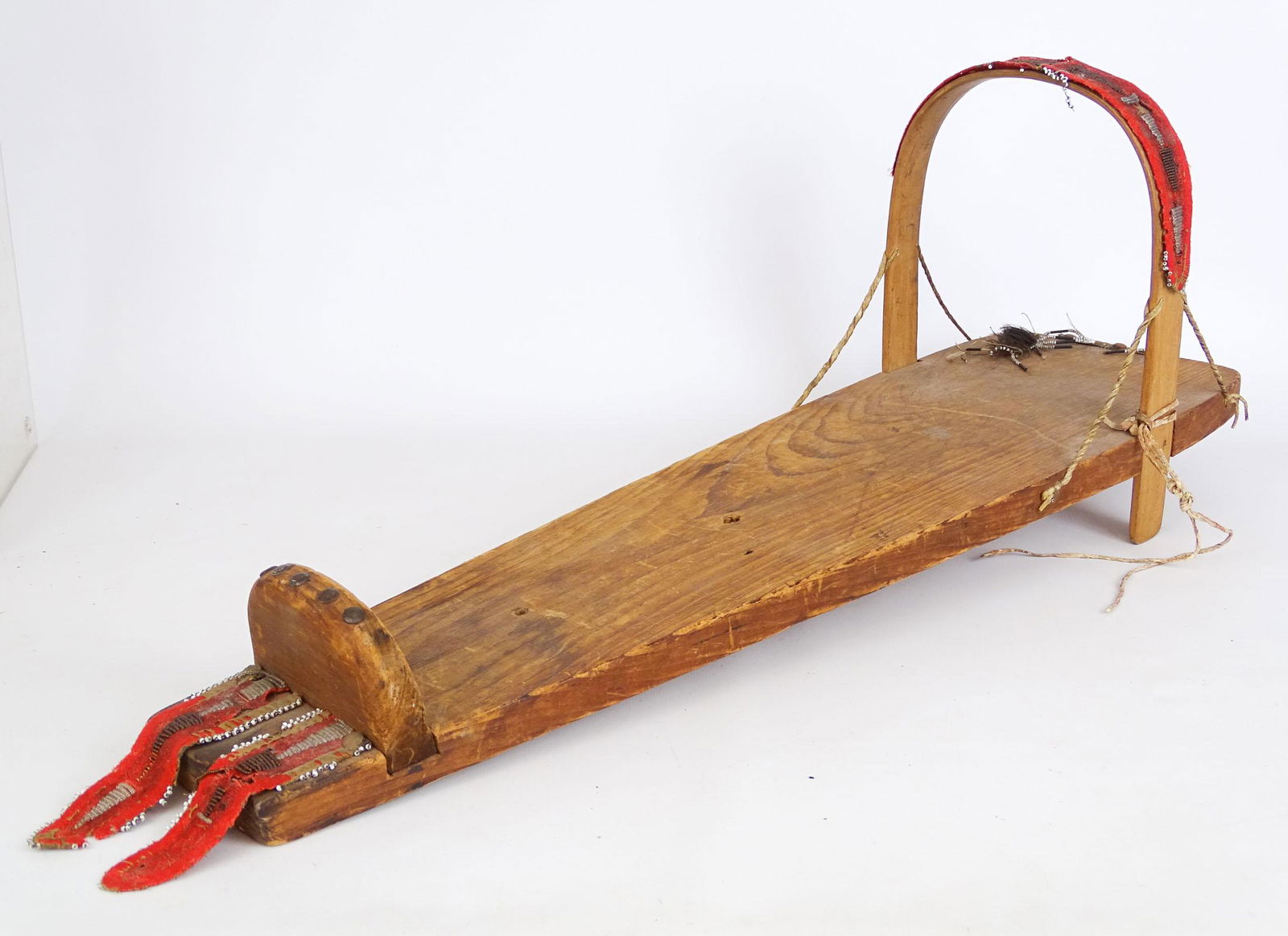 SoldNATIVE AMERICAN BEADED PAPOOSECondition: beads intact. Some splintering to wood. Provenance: The Estate of Judith Krantz, Bel Air 37 inches wide; 9 inches deepSee Sold Price