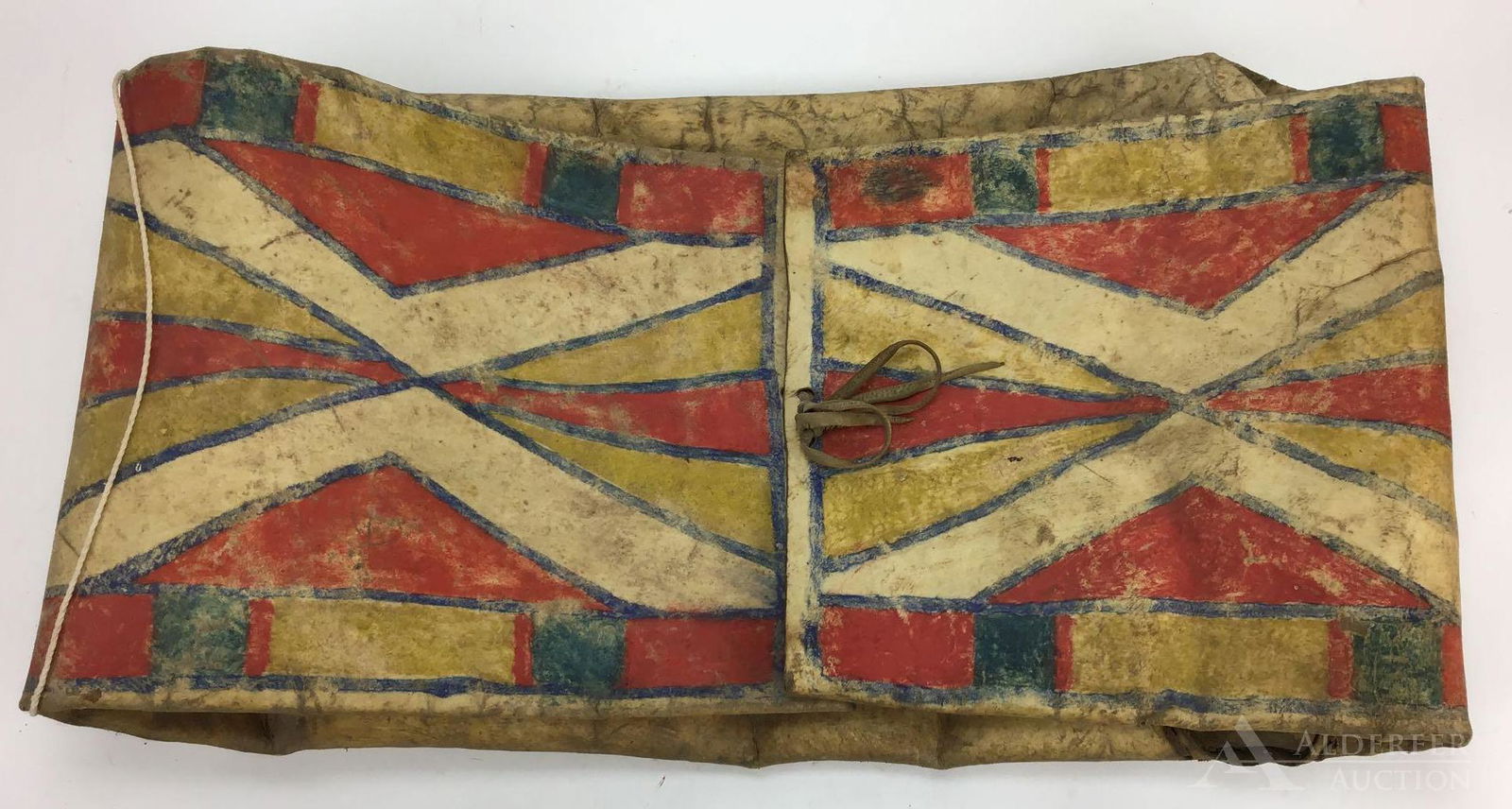 SoldNative American Plains Painted Parfleche Bag w/ COANative American Plains polychrome painted parfleche bag, buffalo rawhide envelope pouch with thonged flaps having red, green, blue, and yellow geometric designs possibly symbolizing landscape featuresSee Sold Price