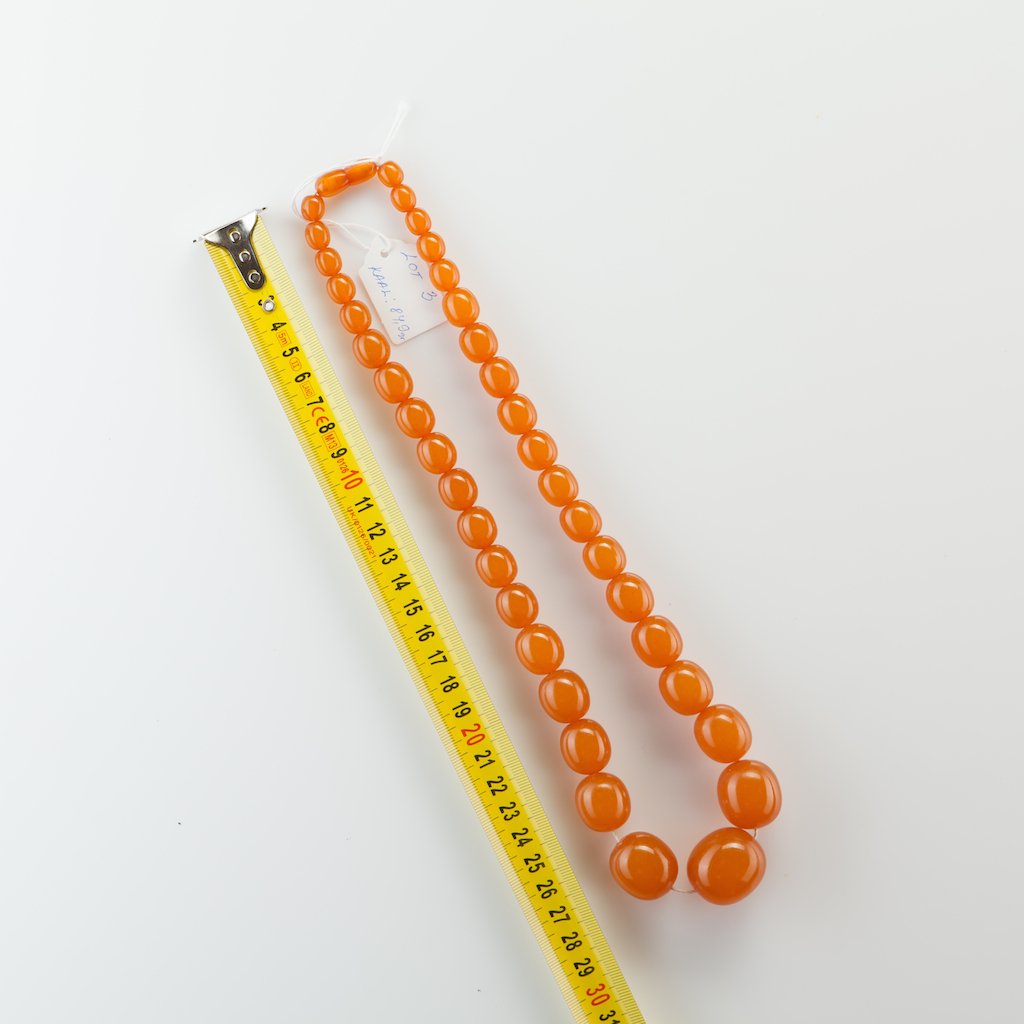 Sold84 g. natural Baltic amber necklaceWeight: 84 gram Beads size: 17-18 mm. Length: 510 mm Stone: 100% natural Baltic amber Treatment: pressed Tested 100% natural pressed Baltic amber: floats in salt water and smells as pine tree if you wSee Sold Price