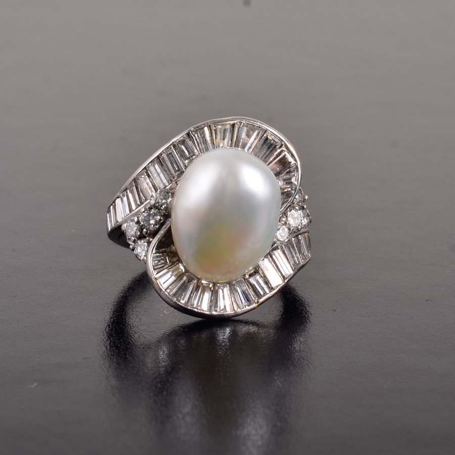 PLATINUM, PEARL AND DIAMOND RING WITH GLA REPORT