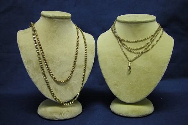 SoldANTIQUE / VINTAGE 10K-14K YELLOW GOLD AND OTHER WATCH / LORGNETTE NECKLACE CHAINS, LOT OF TWOANTIQUE / VINTAGE 10K-14K YELLOW GOLD AND OTHER WATCH / LORGNETTE NECKLACE CHAINS, LOT OF TWO, comprising a yellow gold example with a chain having thin elongated curb links tested between 10K anSee Sold Price