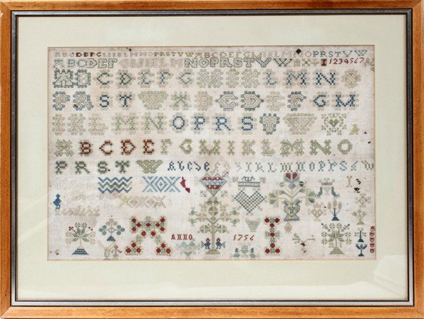 NEEDLEWORK SAMPLER, DATED 1756, H 13", W 22"