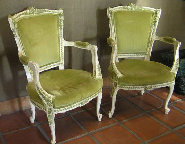 SoldPair of Continental Polychrome FauteuilsPair of Continental Polychrome and Parcel-Gilt Fauteuils ca. 1900, in the transitional rococo-into-neoclassical style, each with an upholstered medallion back and ribbon-and-leaf-carved crest rail, thSee Sold Price