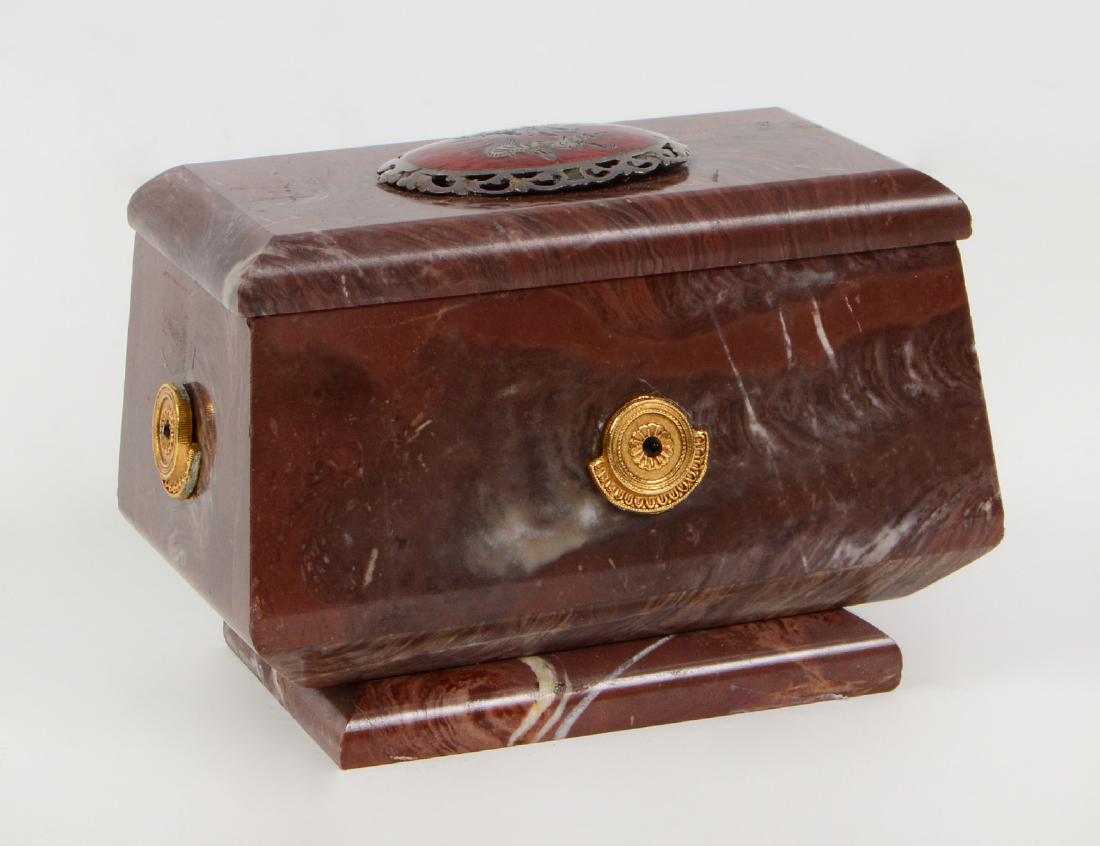 SoldSmall Neoclassical Painting on Marble and Tin Box with Neoclassical DesignSmall Neoclassical Painting on Marble and Tin Box with Neoclassical Design, the small painting on red marble, using the negative space to simulate a Greek Red Figure vase painting, in a bronze frame wSee Sold Price