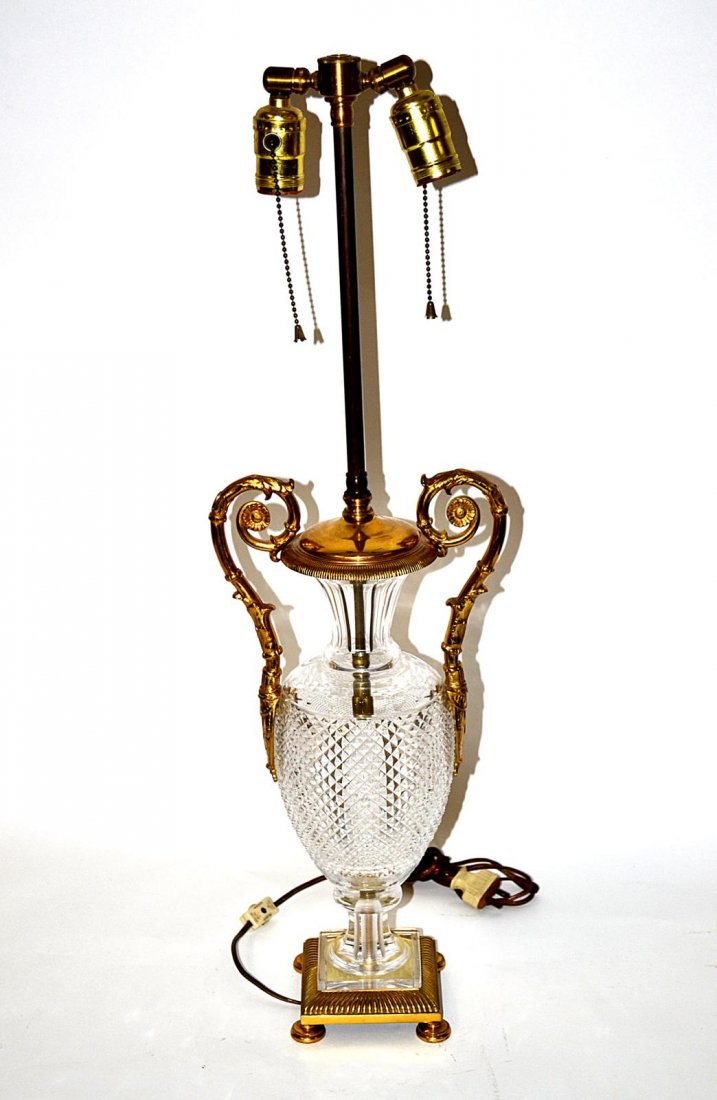 SoldCrystal Urn Form Lamp w Gilt Bronze MountsCrystal Urn Form Lamp w Gilt Bronze Mounts in the Victorian and Neo Classical Style. This lamp is contemporary and electric. 20 inches x 7 inches in diameter.See Sold Price