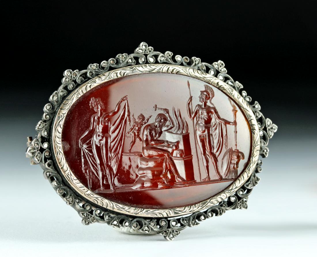 Neoclassical Brooch w/ Agate Intaglio, Silver, Diamonds