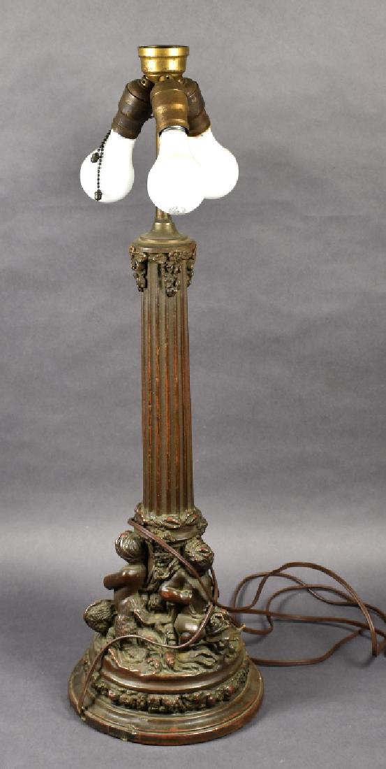 SoldBronze neoclassical oil lamp base decorated with various figures, no burner, chimney, height is 15"Bronze neoclassical oil lamp base decorated with various figures, no burner, chimney, height is 15"See Sold Price