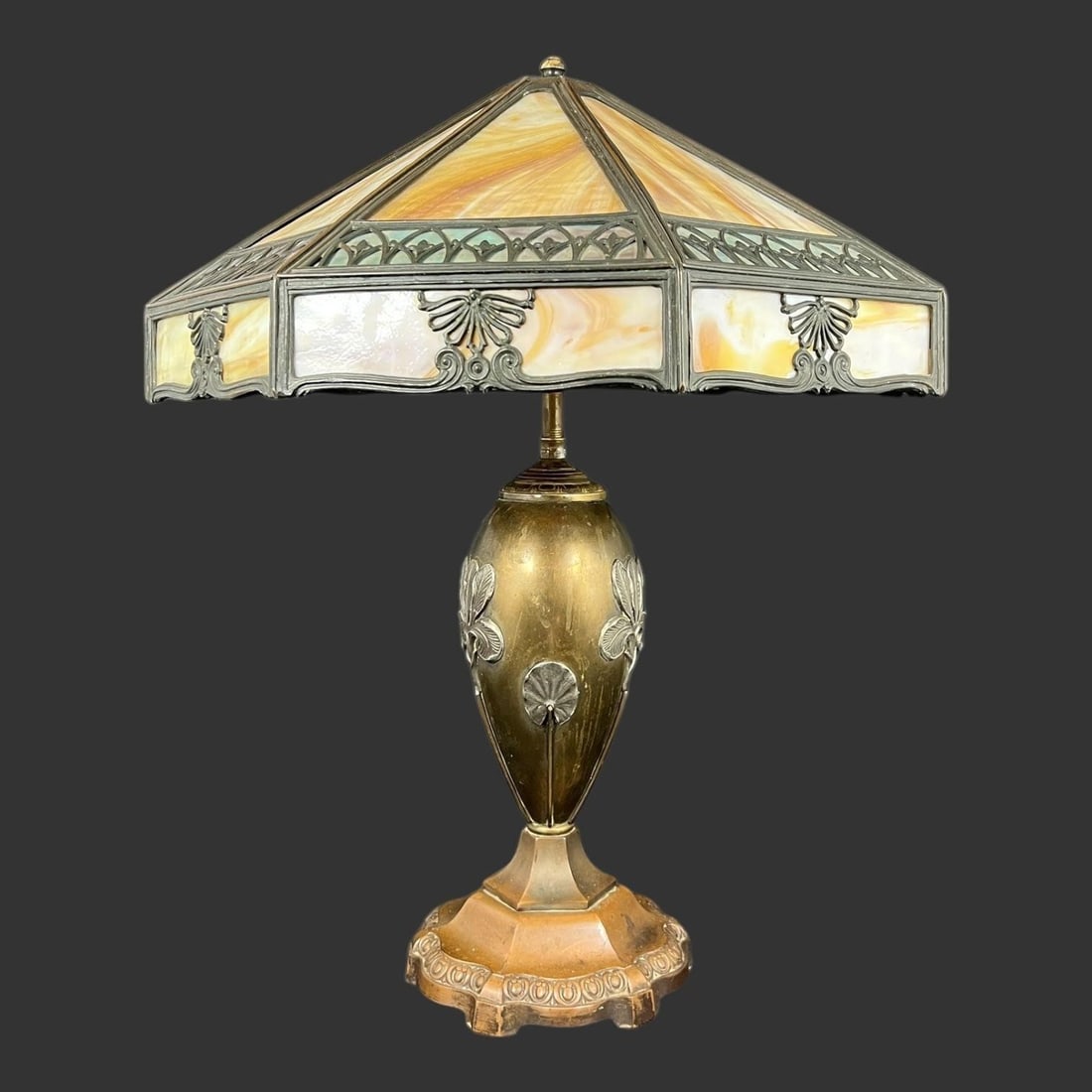 ANTIQUE SLAG GLASS TABLE LAMP W/ METAL OVERLAY