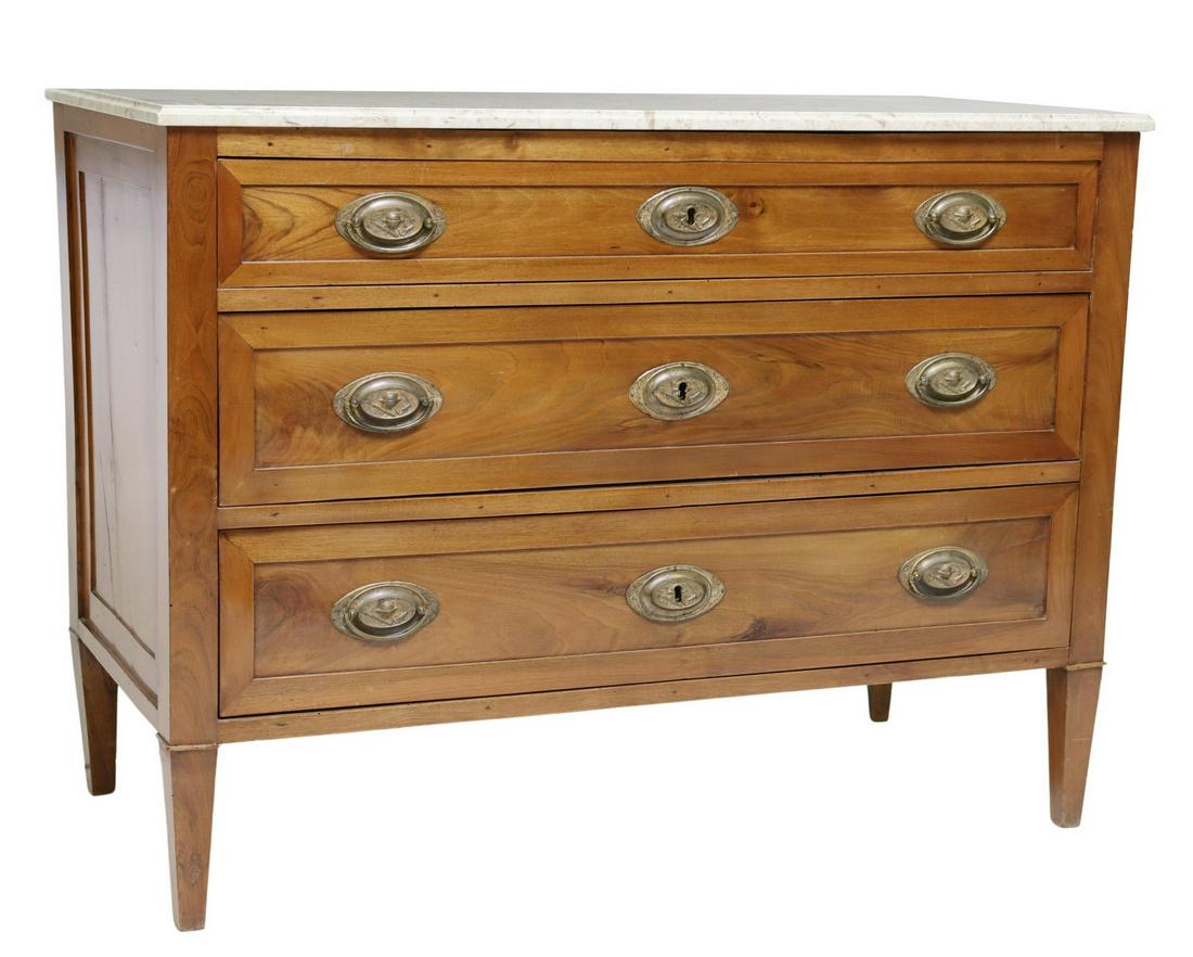 SoldA Continental Neoclassical Style Marble Top CommodeA Continental Neoclassical Style Marble Top Commode19th century, fruit wood with oak and pine secondary, shaped molded conforming top, upper fluted frieze with central relief carved rosette, two longSee Sold Price