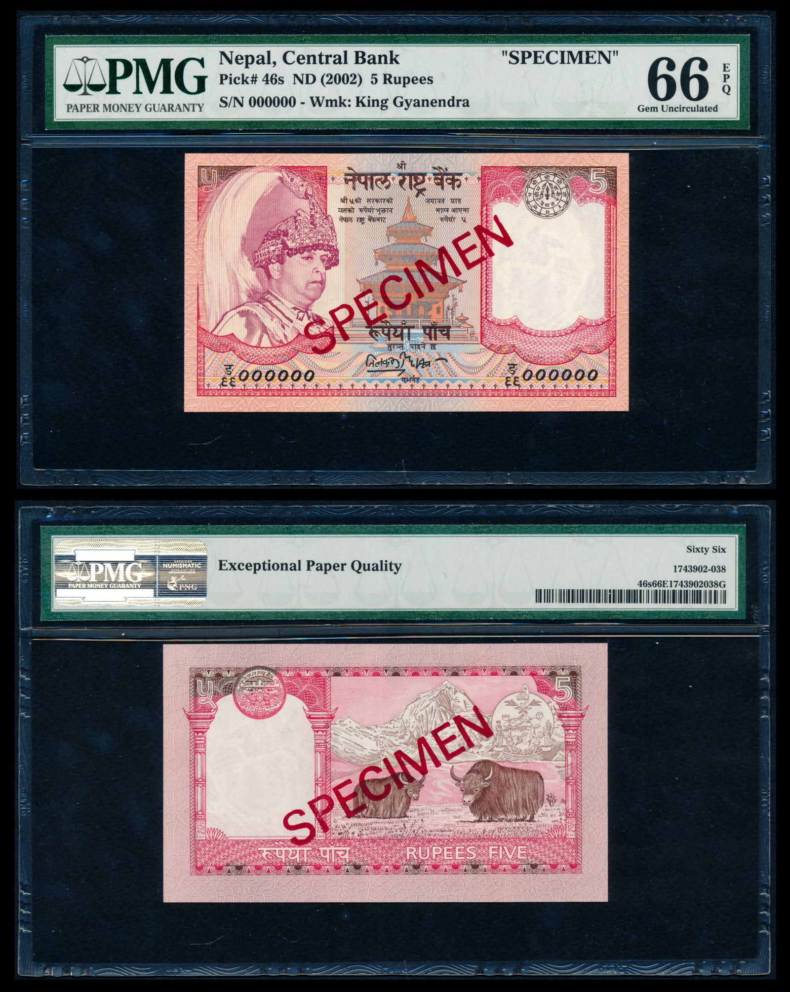 Nepal 5 Rupees 2002 specimen PMG
