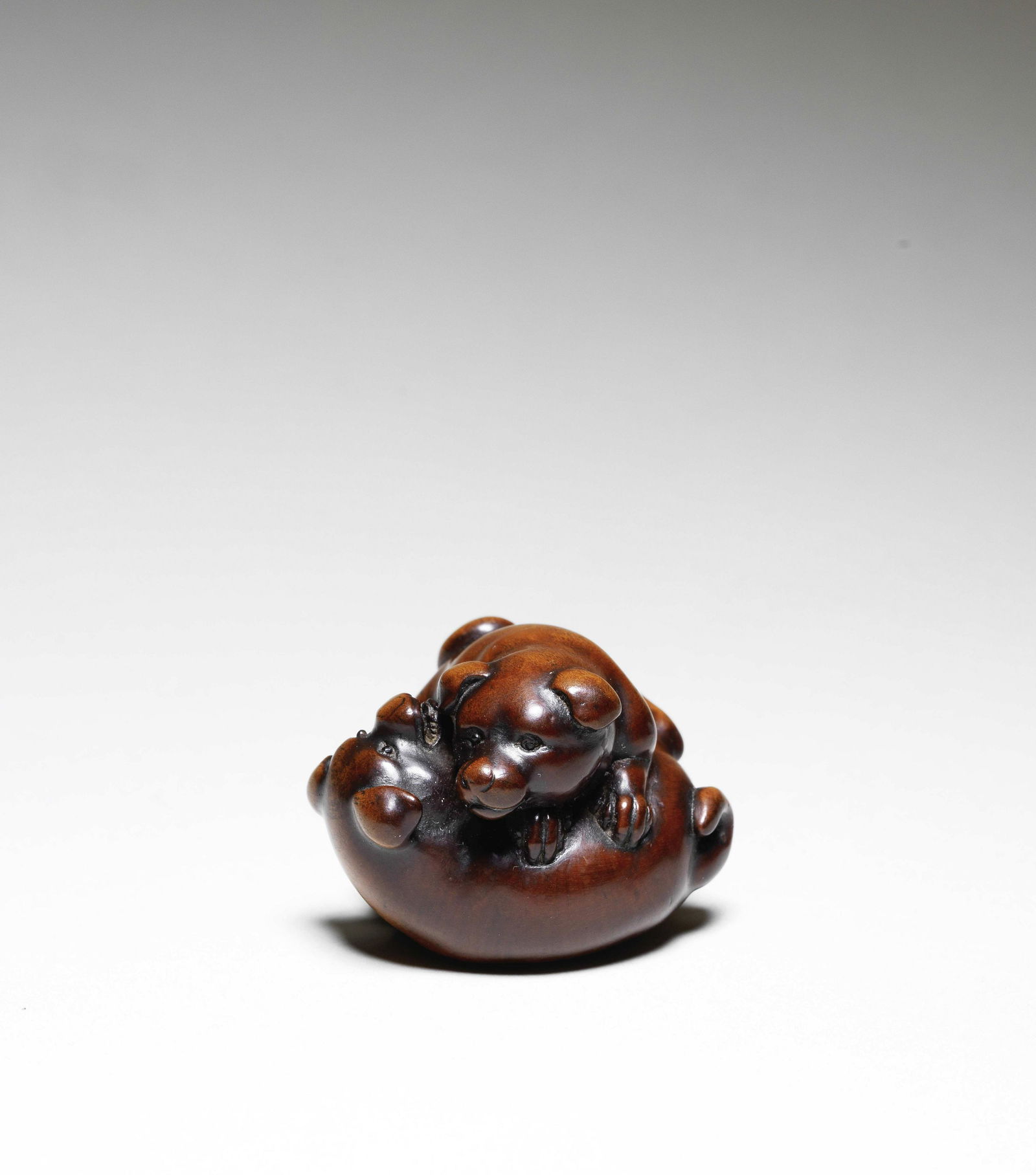 NETSUKE EN BOIS REPRÉSENTANT DEUX CHIOTS XIXe siècle