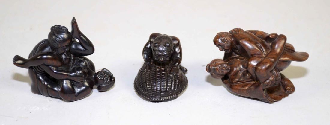 NETSUKE, three wood erotic scenes, all signed.