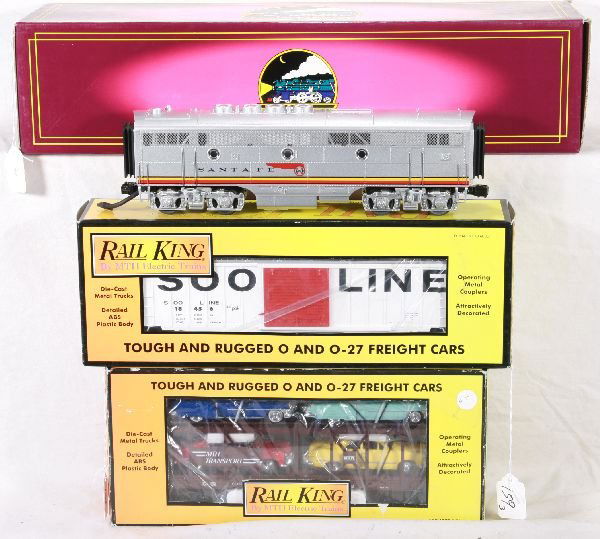 SoldMTH RailKing Diesel LotIncludes a 30-2130-0 PRR F3 AA Diesels with dual flywheel motor, headlight & electronic horn; 30-2289-3 John Deer F3 non-powered extension piece. Both are new in boxes, C10See Sold Price
