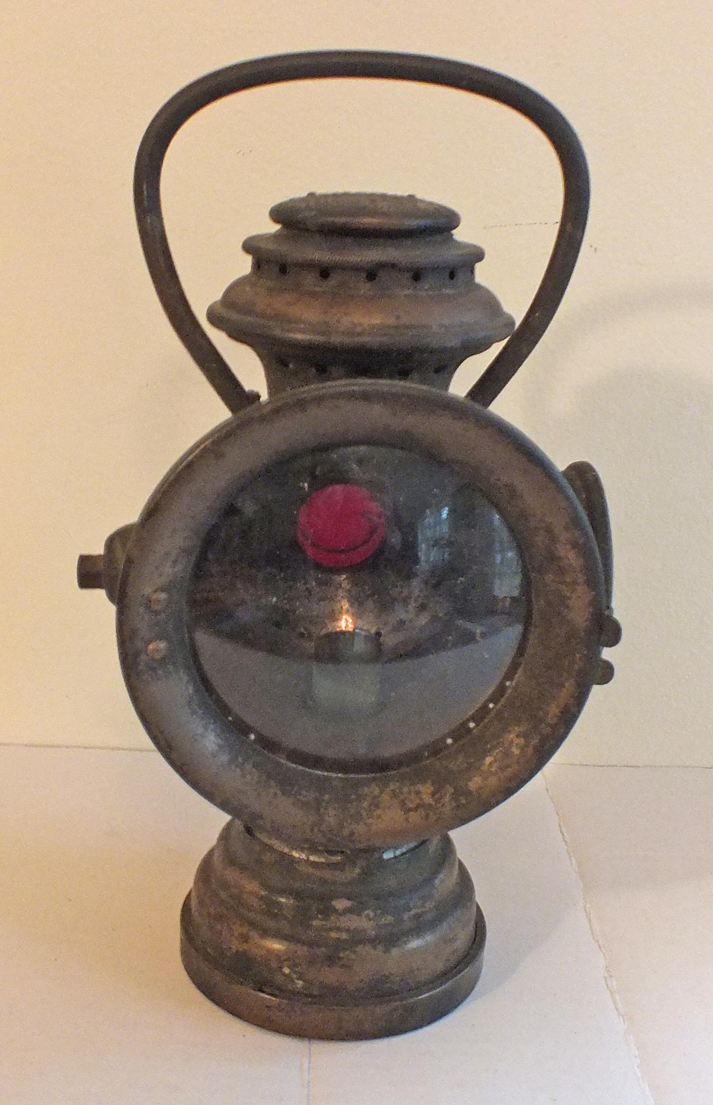 SoldOdd Ball - Early Lantern Bullseye LensWe sold a similar lantern a few auctions ago. This is an earlier model. I see no patent information. It has a 4 1/2" bullseye lens. It has a wire bail and flat mount "carriage" style mount. The pot haSee Sold Price