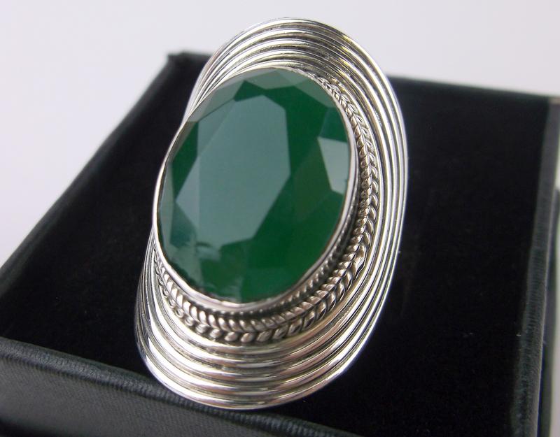New Boxed Large Sterling Silver Green Stone Ring 7