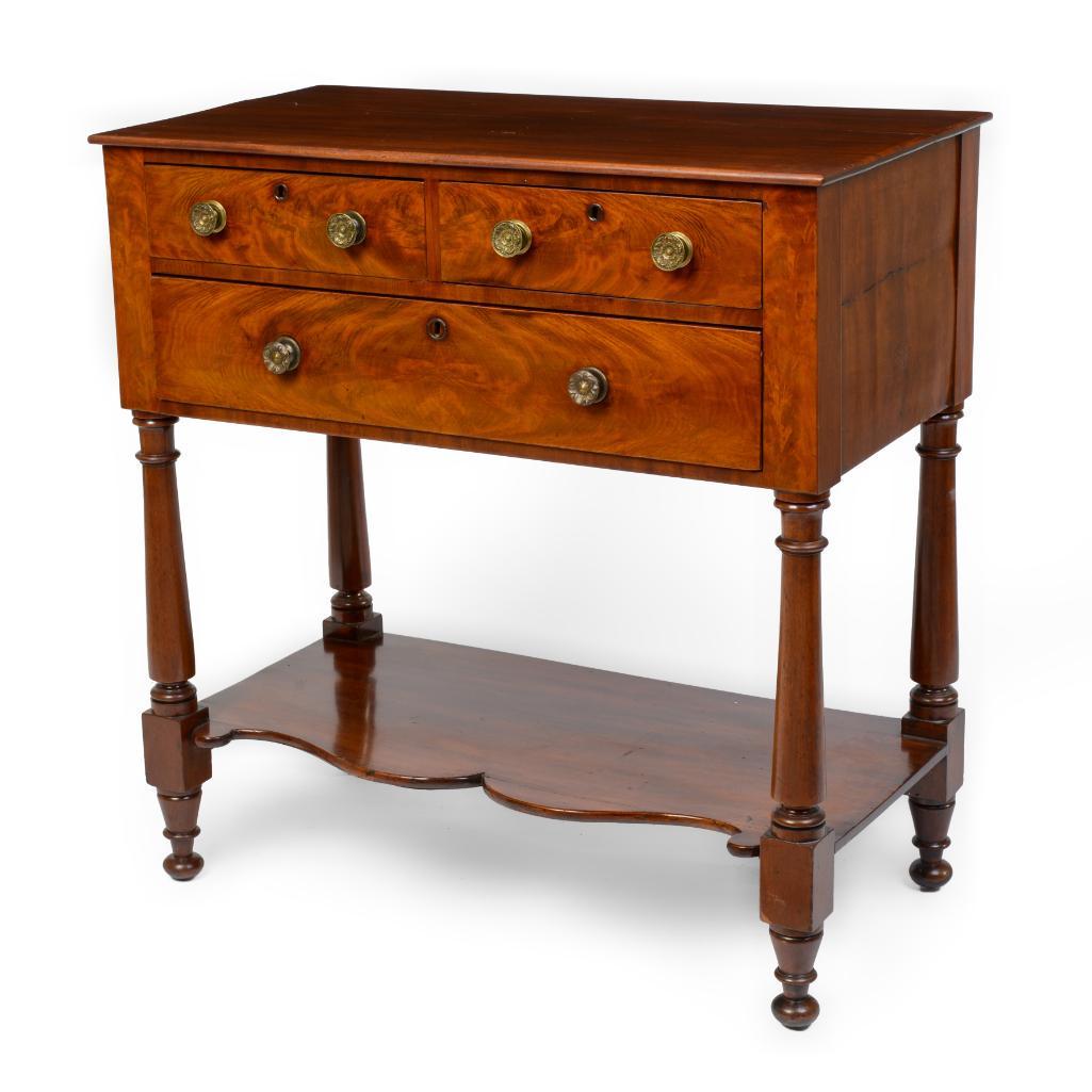 SoldSheraton Biscuit Corner ServerCirca 1810, New England, mahogany with two dovetailed drawers with brass pulls, and nicely turned legs, poplar and pine secondary woods, 39 1/2 x 14 1/2 x 31 1/2" high.See Sold Price
