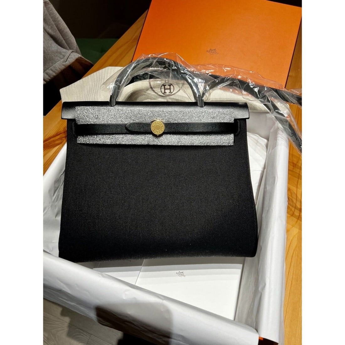 SoldHermes Herbag a Dos PM Backpack HandbagHermes Herbag a Dos PM backpack of officer black toile canvas and black box leather with leather handles and palladium hardware, includes interchangeable bag, cadenas, keys in clochette, dustbag and bSee Sold Price