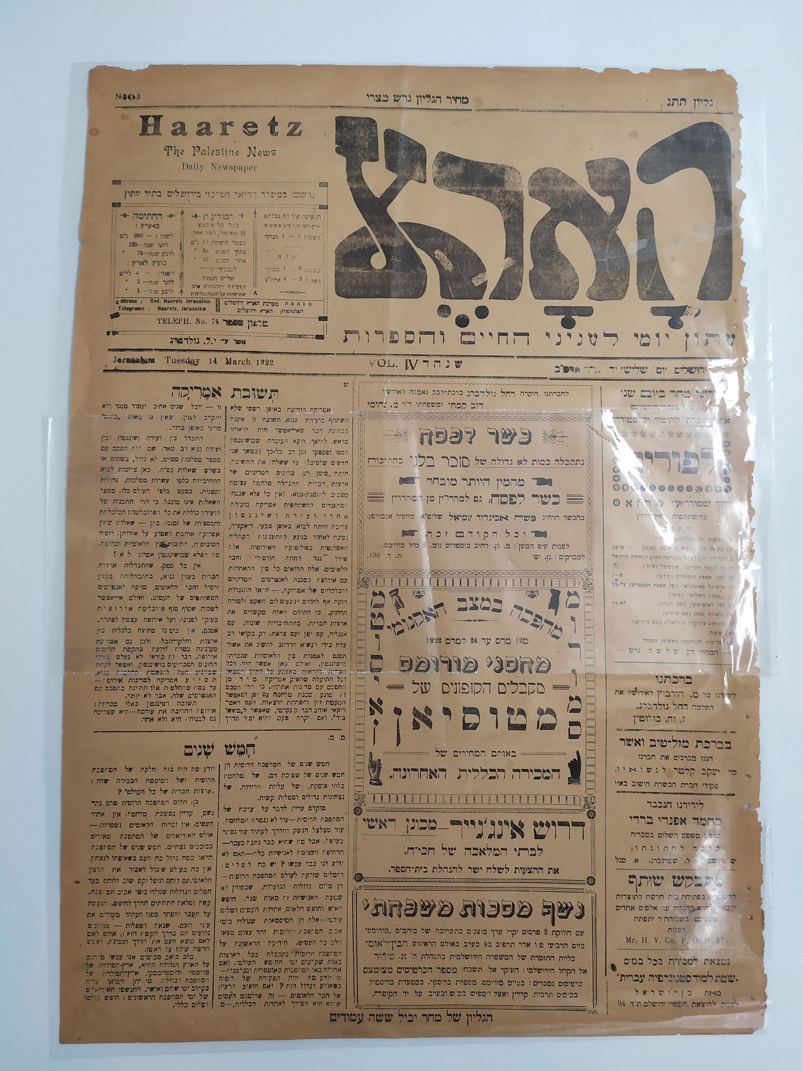 Newspaper 'Haaretz' dated 14/3/1922, the first page