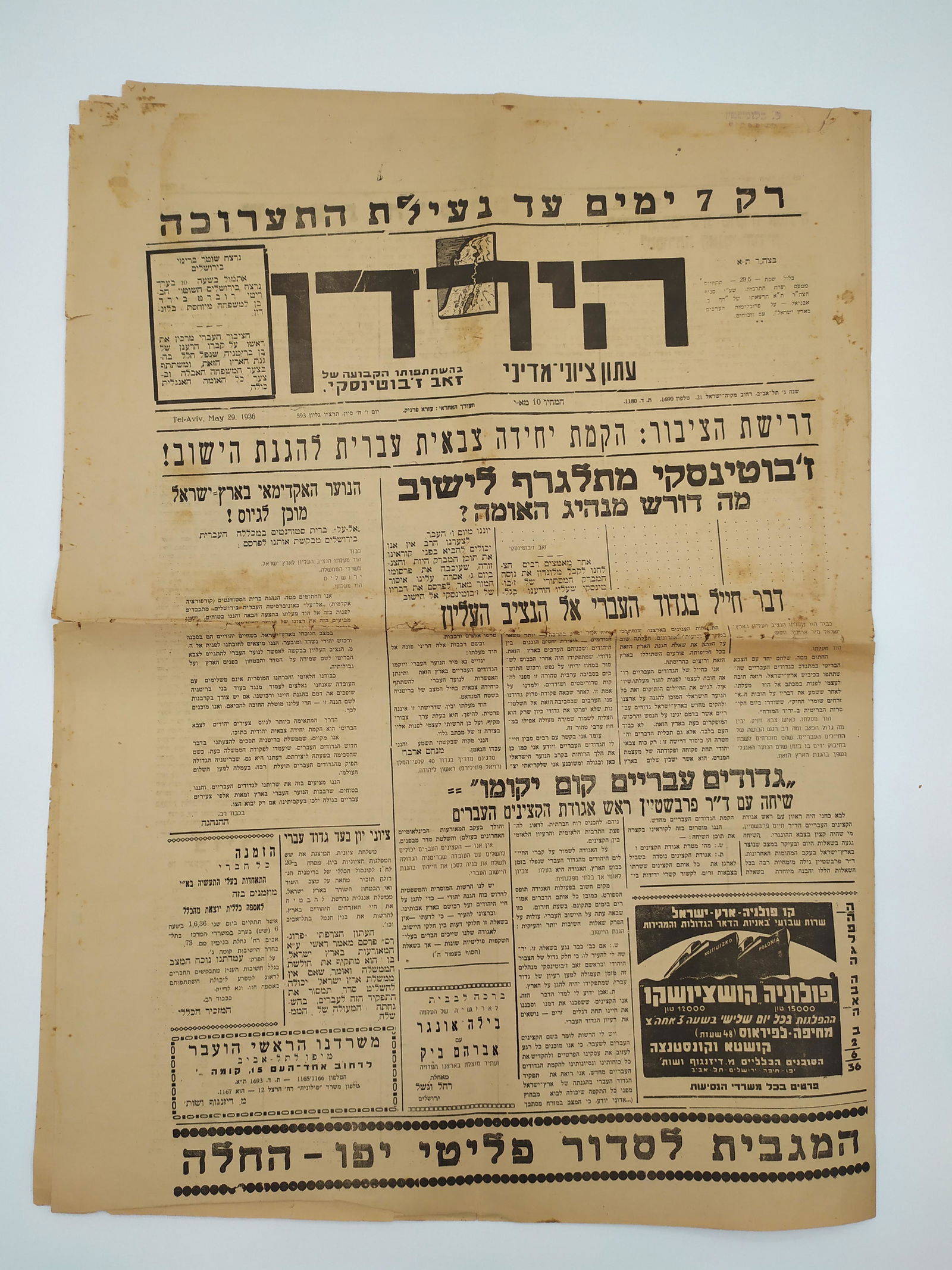 Newspaper 'HaYarden' dated 29.5.1936, calling to