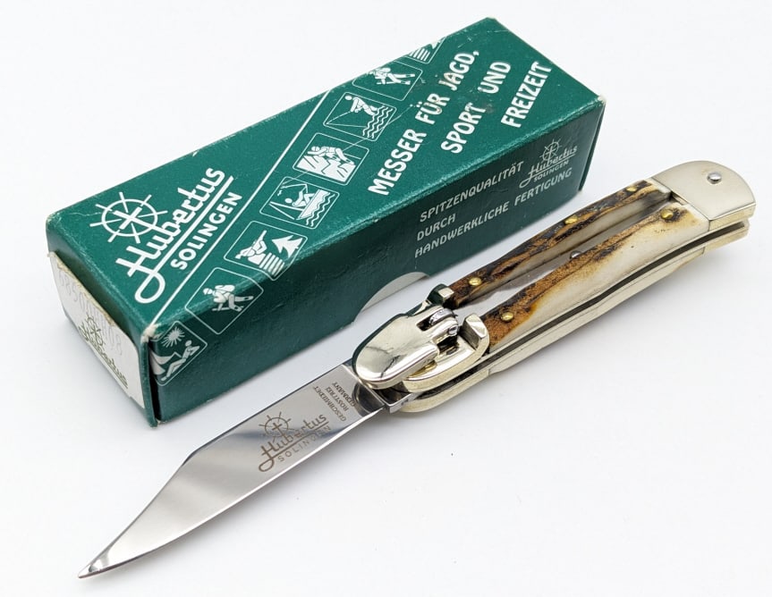 NIB Hubertus Solingen Stag Leverlock Switchblade Knife