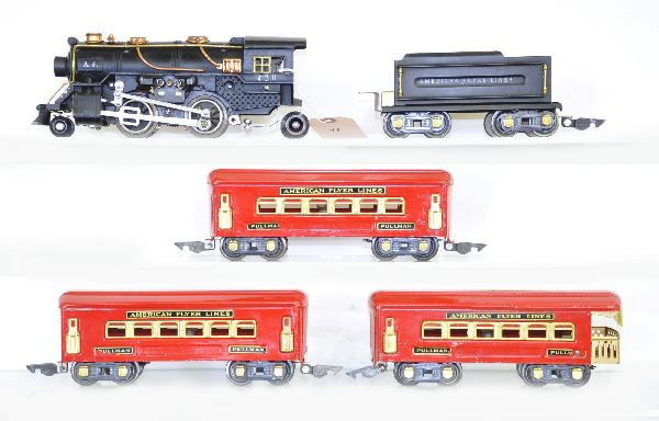 Sold1937 American Flyer Passenger SetIncludes a 420 Steam loco, missing trailing truck; 3189 Tender; 2- 404R Pullmans; 405R Observation. All are clean, cars are shiny, showing light to moderate play wear, with rough car boxes.See Sold Price