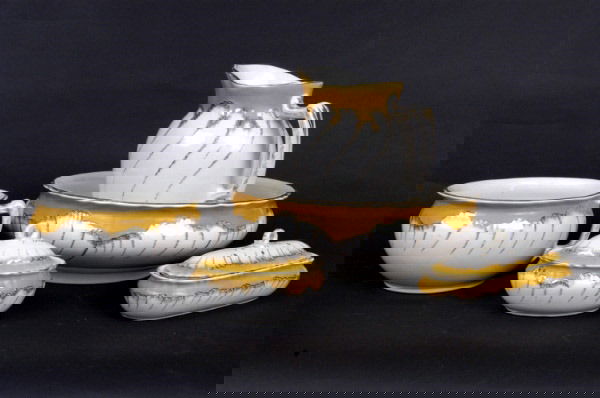 Lot of Empire porcelain gilt cups and saucers. 1) Gilt ground with raised white beaded border.Mar 01, 202617-Piece Royal Doulton Coffee Pot, Cups, & Saucers - The Chelsea Rose PatternFeb 21, 2026Copeland Spode Buttercup Dinner Service for 4Mar 10, 2026Christian Joachim for Royal Copenhagen. "The Spanish pattern". Coffee pot with sugar bowl andRoyal Copenhagen service no. 607. Porcelain sauce bowl. Gold border with foliage. Model numberRoyal Worcester, England. Two Evesham sauce jugs with saucers in porcelain decorated with fruits andFive Royal Crown Derby Porcelain PiecesFeb 21, 2026TINY GERMAN PORCELAIN MINIATURE TOILETTE SET3 days LeftSet 9 Hand Painted Porcelain Landscape Tableware688 Lots AwayRare Antique Meissen Porcelain Birds tea setMar 01, 2026A NYPHENBURG PORCELAIN PART TEA AND DESSERT SERVICE THIRD QUARTER 20TH CENTURY, GREEN PRINTED7 days Left52 Piece Assembled Spode and Coalport Tea and Coffee ServiceFeb 21, 2026Nymphenburg Porcelain Partial Dinner Service, 26Mar 12, 2026Rosenthal "Golden Grail" Porcelain Service, 60Mar 12, 2026Limoges Painted Porcelain Tableware, 4 Pcs.Mar 12, 2026A Collection of Midwinter and Lenox Temper-ware Merriment Ceramic Tableware4 days Left
