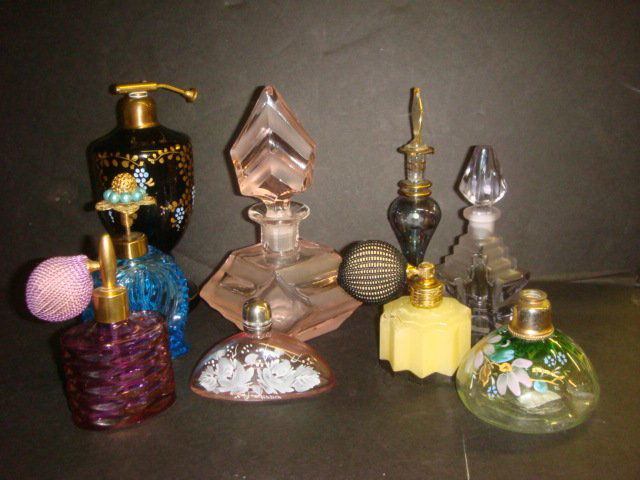Nine Assorted Colored Glass Perfume Bottles