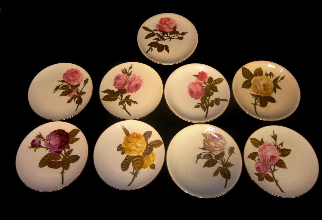 Nine Minton Hand-Painted Rose Plates