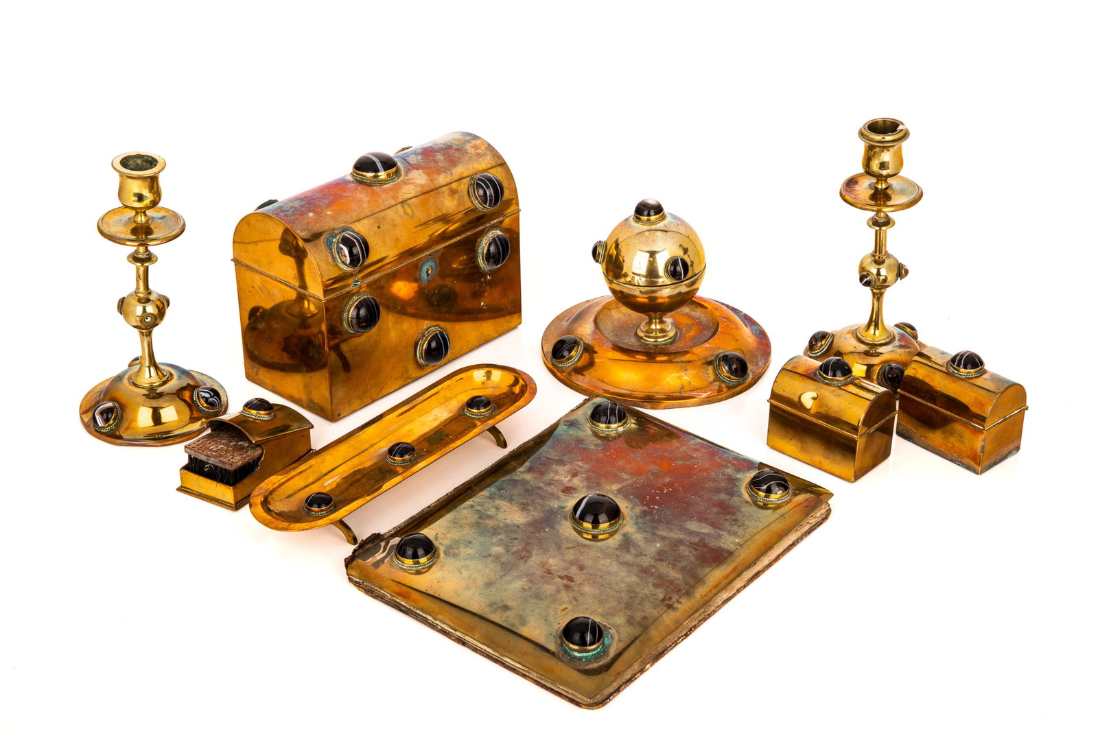 NINE PC SCOTTISH BRASS AND AGATE DESK SET