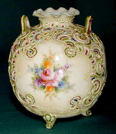 Nippon Moriage 3 Footed 2 Handled Vase NR