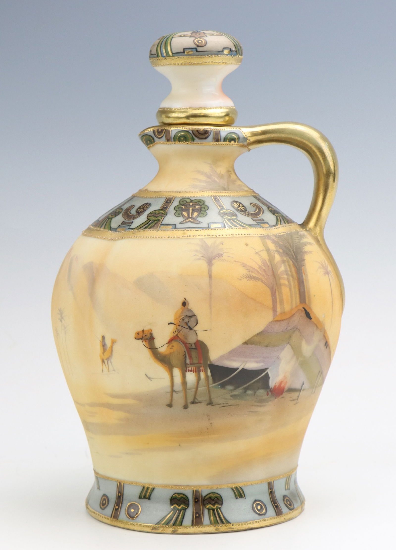 SoldNIPPON PORCELAIN EWERNIPPON PORCELAIN EWER, having an ornate split molded handle, folded rim at spout, wide oblong form with hand-painted polychrome landscape and floral design with gilding. Green "M" within a wreath forSee Sold Price