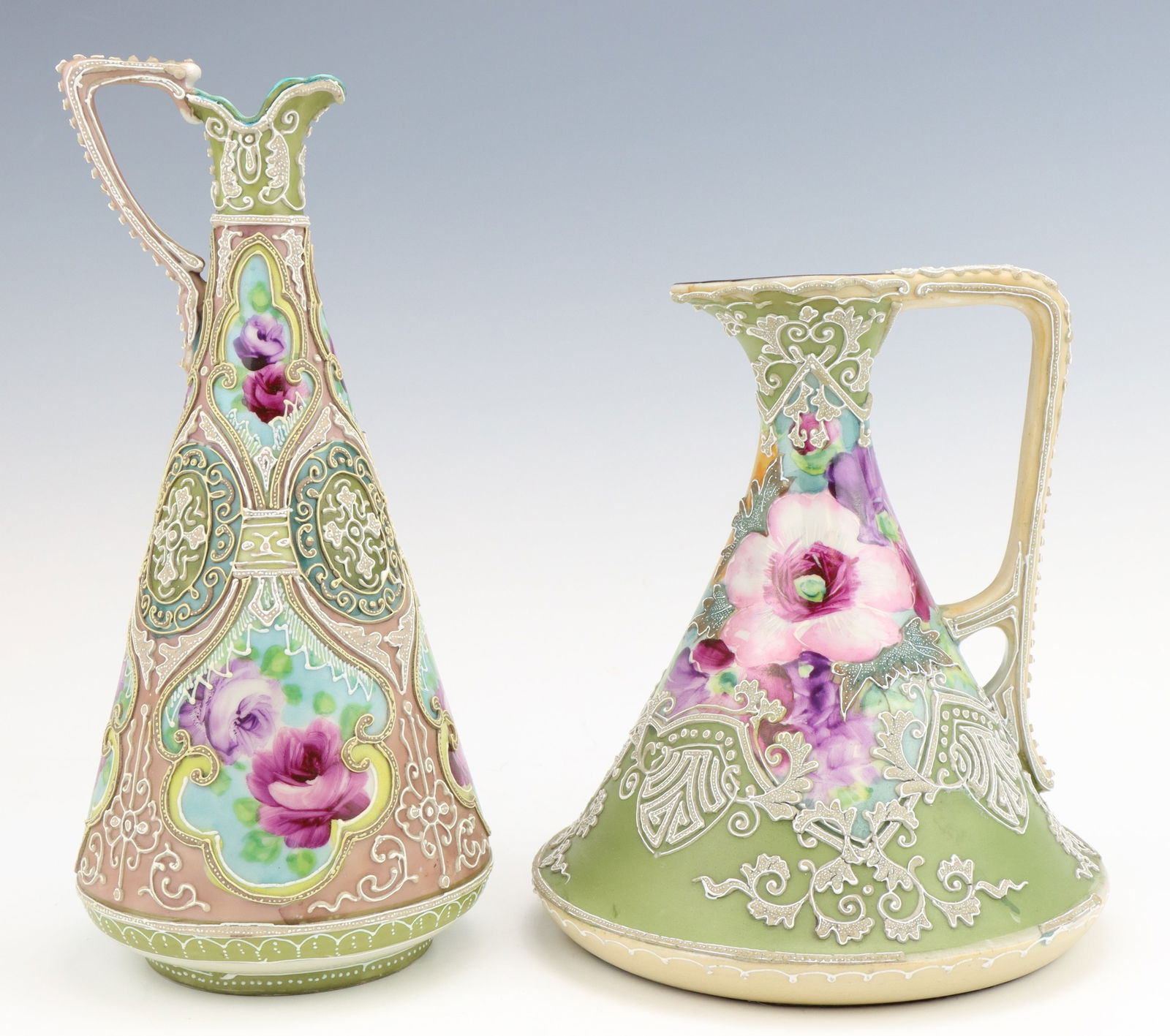 Sold2 VINTAGE NIPPON MORIAGE ENAMEL PORCELAIN ITEMSA lot of 2 vintage hand painted and enameled Nippon Japanese moriage items to include a ewer and a covered canister. Both having floral bouquet designs. Tallest approx. 10 3/8".See Sold Price