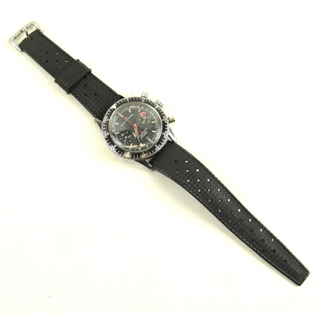 SoldVintage Men's Winding Watch, Croton Sea DiverVintage Men's Winding Chronograph Wristwatch, Signed "Croton Nivada Grenchen" and "Chronograph Aviator Sea Diver". Steel case with bezel, black face with baton style radial dial, inner tachometer dialSee Sold Price