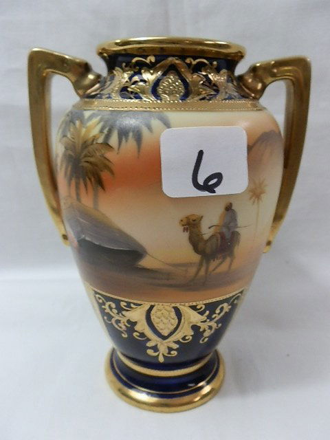 A PAIR OF JAPANESE NORITAKE CHINA TWO HANDLED VASES, baluster form, enamelled and gilded with desertA PAIR OF JAPANESE NORITAKE CHINA TWO HANDLED VASES, baluster form, enamelled and gilded with desert scenes, 16cm high; and A PAIR OF JAPANESE SATSUMA CHINA VASES, decorated with figures on cobalt blu