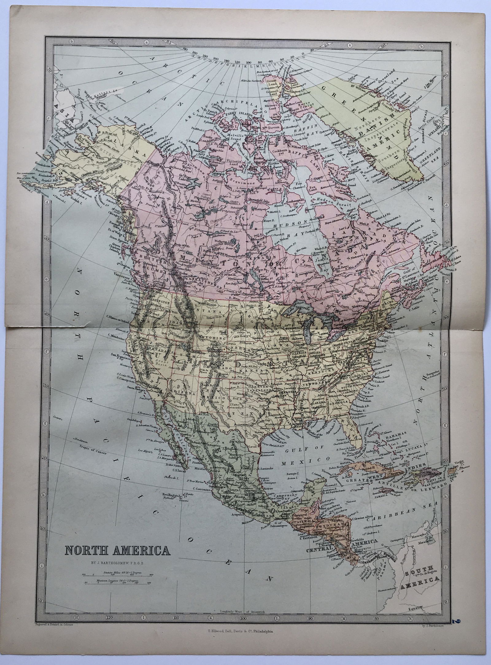 Sold1873 North America MapAuthor: Bartholomew Title: 1873 North America Map Medium: Ink on Paper Dimensions: 13"X17.5" Map of North America dated 1873. Part of Zell's Descriptive Hand Atlas of the World. Published in PhiladelpSee Sold Price