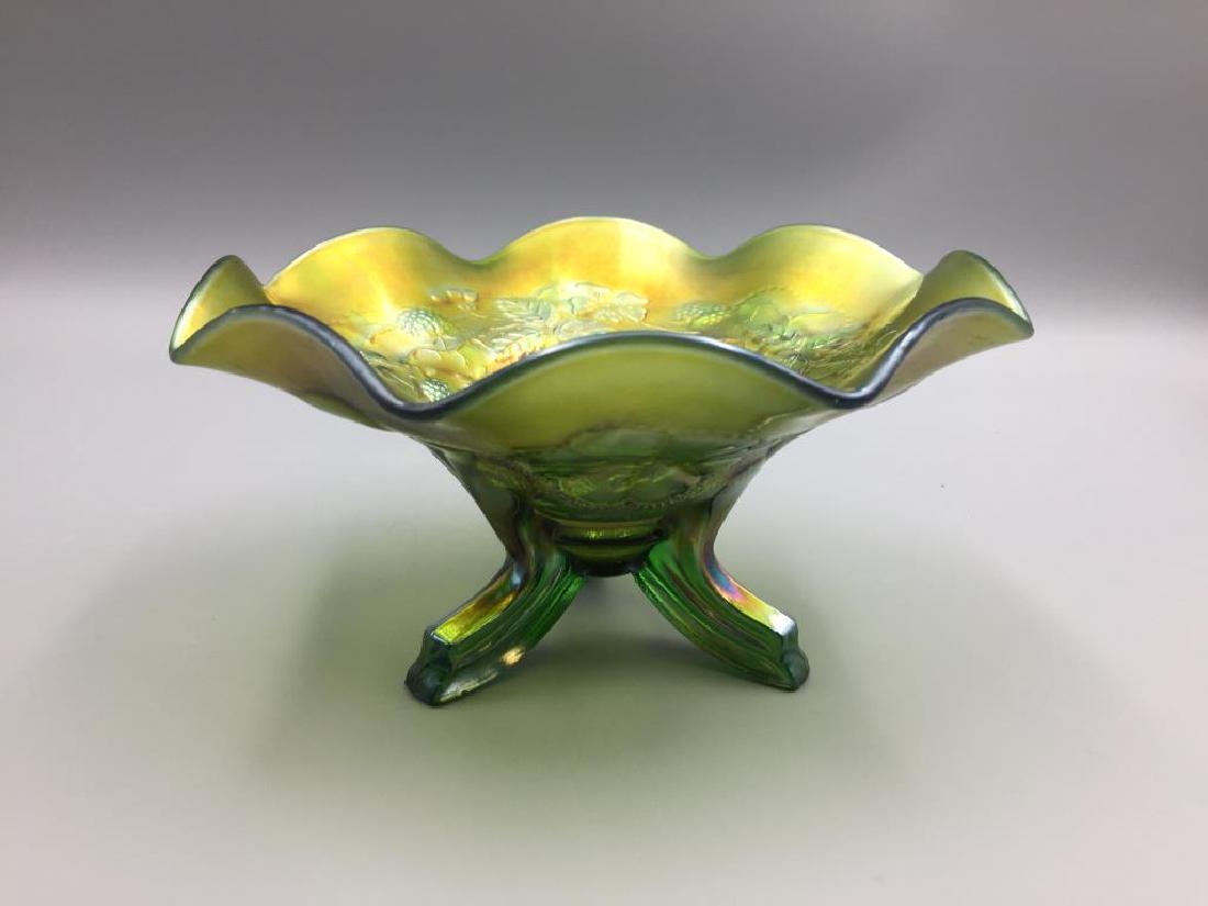 Sold(2 PIECES) CARNIVAL GLASS:7 INCH FINE CUT & ROSE THREE-FOOTED BOWL, GREEN & 9 IN. NORTHWOOD SUNFLOWER THREE-FOOTED BOWL, GREEN - BOTH GOODSee Sold Price