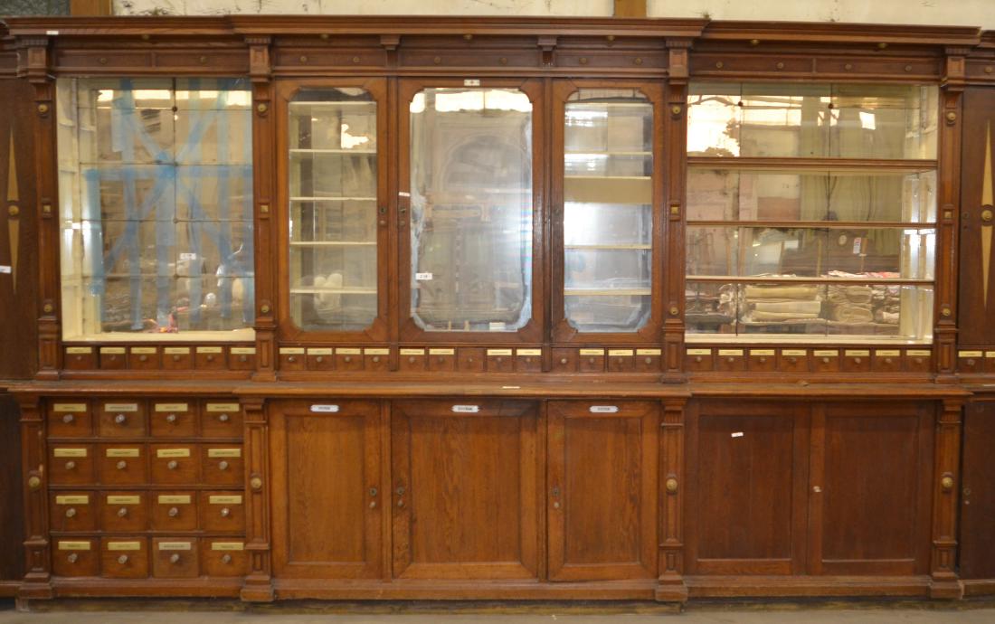 SoldOak Apothecary Store Cabinet Backbar Shelf & 33 DrawersOak Apothecary Store Cabinet Backbar Shelf & 33 Drawers. This apothecary cabinet will be a great display in any retail store. The cast iron drawer pulls are all original. One even has most of the reveSee Sold Price
