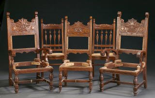 SoldSet 12 19th C Carved Oak Dining Chairs, Leather Upholstered 2 Arm 53 1/2"H X 24"W X 20"D + 10 SideSet 12 19th C Carved Oak Dining Chairs, Leather Upholstered 2 Arm 53 1/2"H X 24"W X 20"D + 10 Side 46"H X 19"W X 16"DSee Sold Price