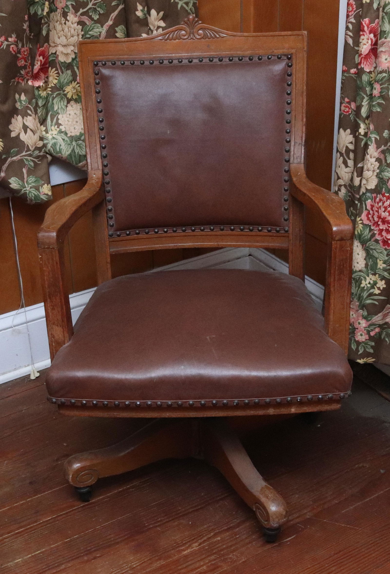 SoldSwivel Office ChairAdjustable height armchair in the style of a Late 19th Century oak office chair, the seat upholstered in leather with brass stud accents, all resting on casters. In good overall condition consistent wSee Sold Price