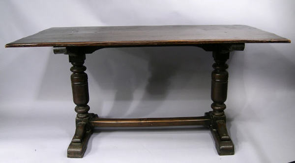 Sold1930'S SPANISH STYLE TRESTLE TABLECARVED BASE, TRESTLE TABLE. OAK. MINOR WEAR TO FINISH. 78" L x 32" W x 30" H. THIS ITEM EXCEEDS SIZE LIMITATIONS FOR IN HOUSE SHIPPING.See Sold Price