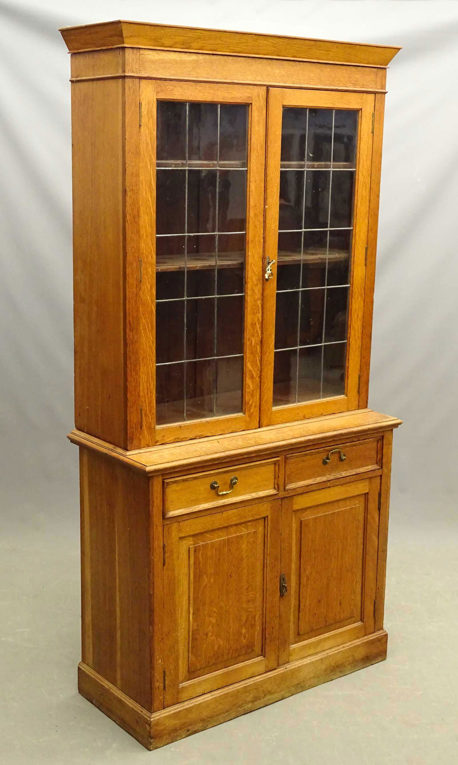 SoldBritish Oak Stepback Cupboard - Old Wavey GlassBritish Oak Tall Bookcase- Old Wavey Glass - 84 in tall x 40 x 18See Sold Price