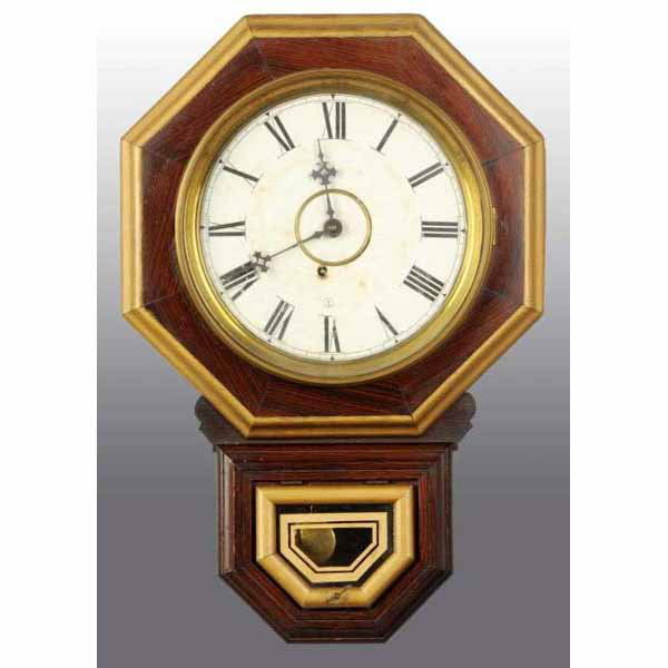 SoldAtkins Octagonal Schoolhouse Wall ClockAtkins Octagonal Schoolhouse Wall Clock. Rosewood case; refinished. Original painted metal dial. Original reverse painted glass. 8 day time and strike spring driven brass movement. Ht. 25" W 17".See Sold Price
