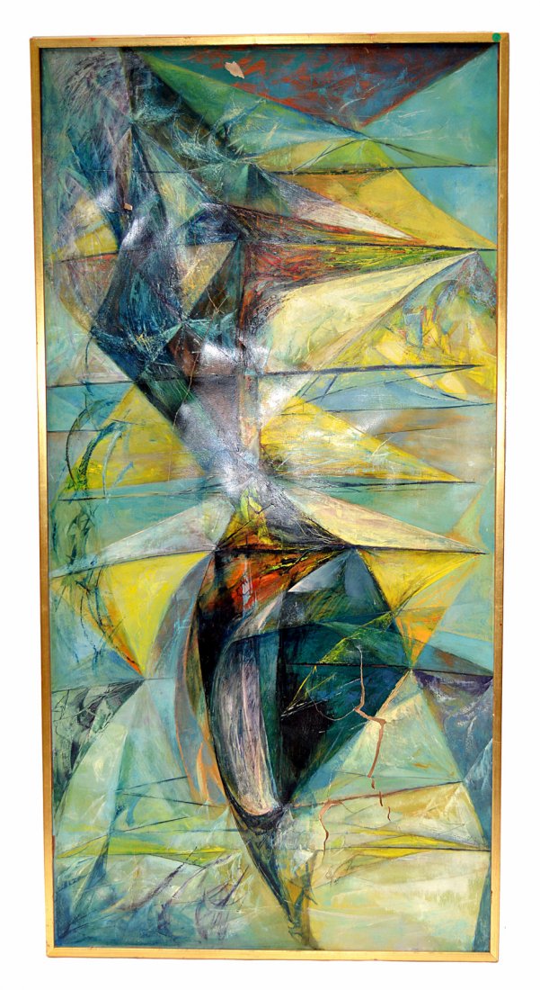James P. Kerr (American, 1953-), "Blue Stripe", oil on canvas, depicting an abstract marine scene wiJames P. Kerr (American, 1953-), "Blue Stripe", oil on canvas, depicting an abstract marine scene with sailboats and a dock, signed lower right, titled on canvas verso, framed, wear consistent with ag