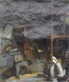 Oil on canvas Men working in Barn