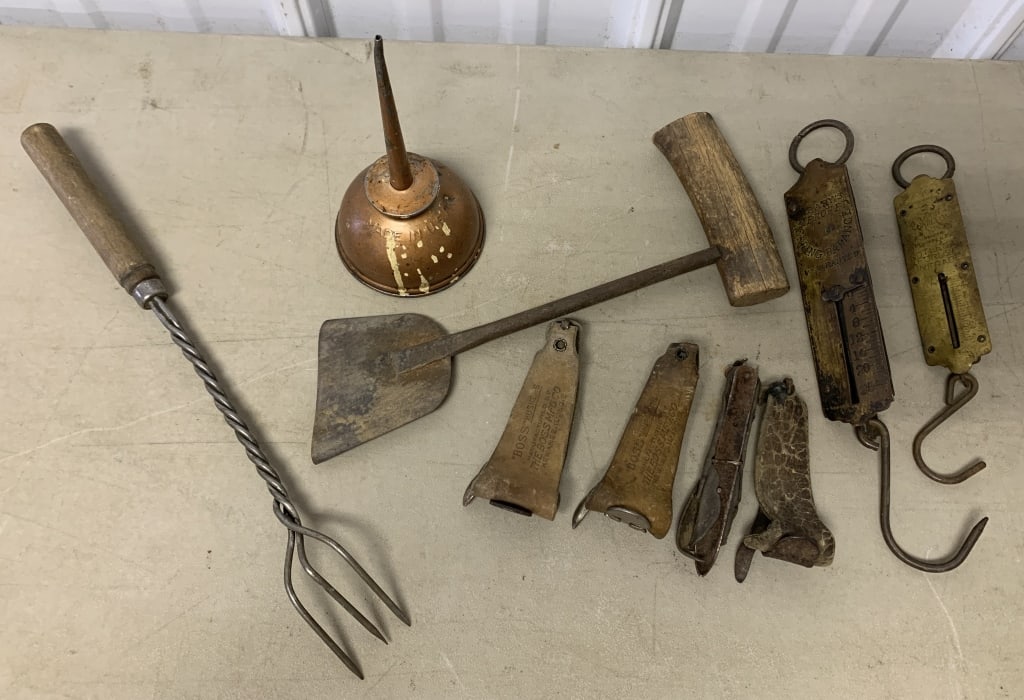oiler, spring scales, corn huskers, knife and fork