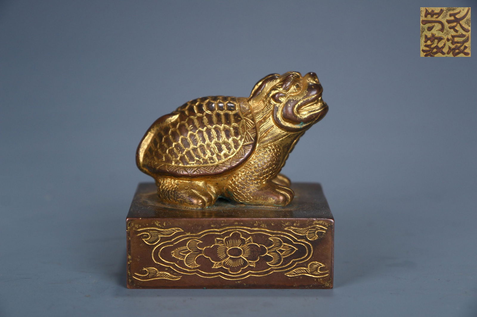 A GILT BRONZE SEAL WITH BEAST KNOB