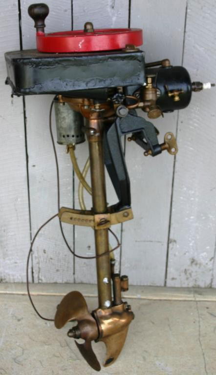 SoldEarly Evinrude Outboard Motor.In very good condition. Brass propeller and many other brass parts on a homemade wood stand. (restored). 36" T.See Sold Price