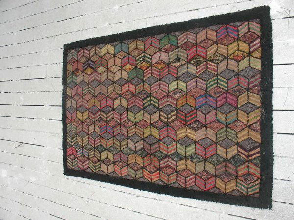 SoldLarge hooked rug in the Log Cabin pattern, veryLarge hooked rug in the Log Cabin pattern, very graphic, late 19th century. Newer sewn border, one small loose yarn in corner, but overall very good condition. Measures 6' 8" x 4' 2".See Sold Price